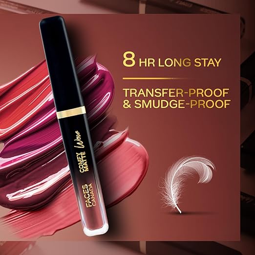 The Faces Canada Comfy Matte Wow liquid lipstick range, where comfort meets style in a collection designed to elevate your every look. Crafted with care and precision, this range offers ten luxurious shades, each carefully curated to complement a spectrum of skin tones, from fair to deep, ensuring there’s a perfect match for everyone.Indulge in a palette that spans from rich browns to flirtatious pinks, classic reds to sultry maroons, and versatile nudes, providing endless possibilities for every occasion and mood. Whether you’re aiming for a subtle everyday elegance or a bold statement, the Faces Canada Comfy Matte Wow range has you covered.Formulated for lasting power, these liquid lipsticks boast an all-day stay and a long-lasting transferproof formula, ensuring your lips remain flawlessly adorned from morning coffee to evening cocktails. Bid farewell to frequent touch-ups as you enjoy the confidence of vibrant color that stays put through it all. But what truly sets Faces Canada Comfy Matte Wow apart is its commitment to inclusivity. Created with Indian skin tones and dark skin tones in mind, each shade is meticulously crafted to enhance the natural beauty of all complexions, embracing diversity and celebrating individuality.Discover the allure of comfort and sophistication with Faces Canada Comfy Matte Wow liquid lipstick range, where every swipe is an invitation to embrace your unique style and leave a lasting impression.